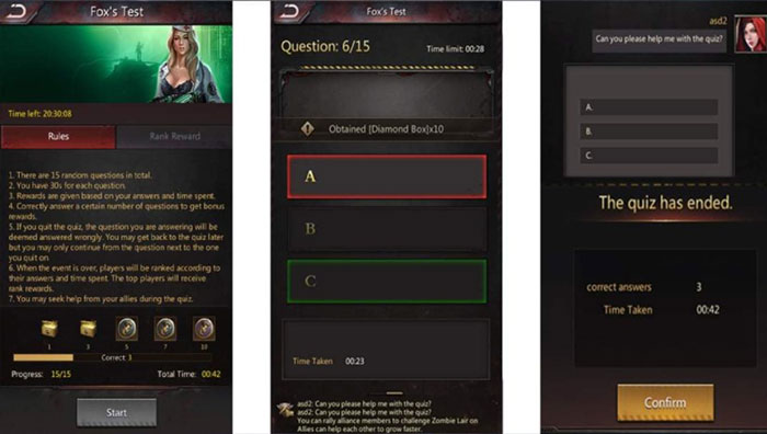 Nếu là một người hâm mộ trò chơi đố vui và có một số kiến thức về Puzzles & Survival, game thủ có thể hoàn thành các câu hỏi đố trong trò chơi (trong mục Quiz) và nhận được nhiều phần thưởng khác nhau, từ tài nguyên đến tăng tốc độ và hơn thế nữa. Người chơi có thể tìm thấy Quiz ở phía bên trái của màn hình, trong tòa nhà Radio (bên cạnh EVA và Fighter Camp).