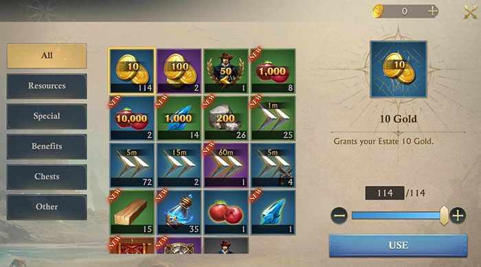 Một số gói trong kho này cũng đi kèm với vàng, loại tiền tệ cao cấp nhất, mang đến nhiều cơ hội hơn để mua những trang bị hữu ích. Ngoài ra còn có các vật phẩm tăng tốc giúp cho tiến trình phát triển nhanh hơn trong giai đoạn đầu.