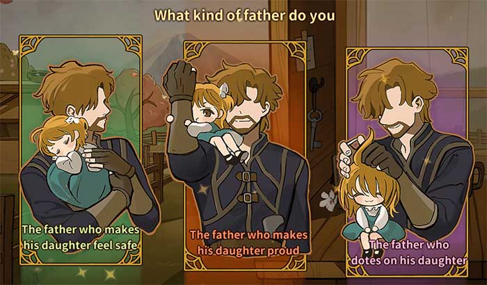 Nếu muốn nâng cao giá trị Gentle của mình, hãy chọn cách tôn trọng những bí mật của con gái mình. Nếu muốn nâng cao giá trị Brave của mình, hãy chọn nhận xét về cách mỗi chiến binh có một rương kho báu duy nhất và nếu muốn nâng cao giá trị Intelligence, game thủ nên chọn các tùy chọn mà người cha nhớ điều gì đó thú vị.