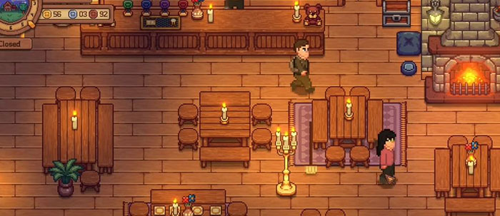 Để mở lò sưởi, hãy nhấp chuột phải vào nó. Người chơi cần chắc chắn ở trong lò có nhiều que, khúc gỗ hoặc than để đốt, bắt đầu với khoảng 5 khúc gỗ để phục vụ khách nguyên ngày.