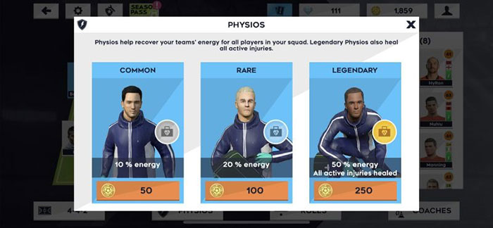 Physios thông thường có giá 50 xu và phục hồi 10% năng lượng cho tất cả cầu thủ. Trong khí đó, người chơi cần tới 100 xu để thuê Physios hiếm để được phục hồi 20% năng lượng. Cuối cùng, Physios hiếm tiêu tốn 250 xu và không chỉ hồi phục 50% năng lượng cho mọi người mà còn hồi phục cho tất cả những người đang gặp chấn thương.