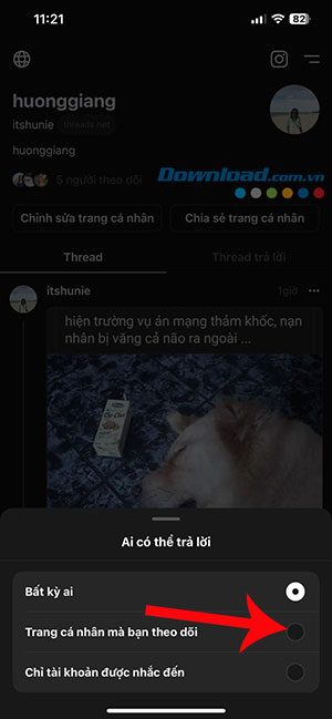 Bước 3: Chạm vào 1 trong 3 tùy chọn Bất kỳ ai, Trang cá nhân mà bạn theo dõi hoặc Chỉ tài khoản được nhắc đến để giới hạn đối tượng có thể trả lời Threads của mình.