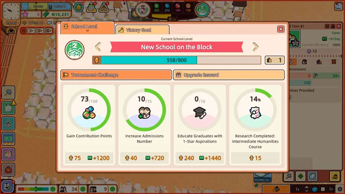 School Leveling có thể truy cập bằng cách nhấp vào biểu tượng công trình xanh ở bên phải. Nó đo lường sự tiến triển và các nhiệm vụ đã hoàn thành để kiếm tiền và Score Point, cũng như các phần thưởng khác.