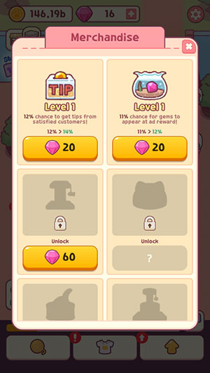 Đừng quên mua mèo giúp tăng tốc và thu hút khách hàng bổ sung. vì điều đó cũng mang đến nhiều lợi nhuận hơn. Ngoài ra, mua hỗ trợ tăng tốc để giảm thời gian nấu cũng giúp tăng năng suất. Mọi người cũng có thể tìm thấy một số vật phẩm trong menu Leveling up sẽ làm tăng số xu kiếm được trên mỗi khẩu phần ăn bán được.
