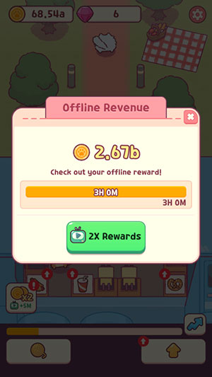 Người chơi cũng có thể nhân đôi tổng thu nhập từ tất cả các menu trong 5 phút. Chỉ cần chạm vào nút x2 xu ở góc dưới bên trái của màn hình để kiếm gấp 2 lần tổng thu nhập từ tất cả các menu/bàn làm việc trong thời gian giới hạn.