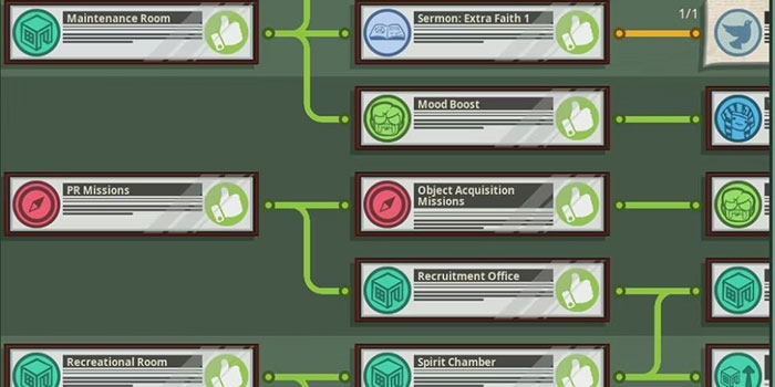 Recreational Room - Phòng giải trí: Điều này không được đề cập trong hướng dẫn ban đầu của trò chơi, nhưng nếu không có giải trí, tâm trạng của những người sùng đạo có thể giảm nhanh chóng. Căn phòng này cũng mở ra Spirit Chamber và Discombobulation Therapy, mang lại cho người theo đạo XP và tầm ảnh hưởng, cũng như lợi nhuận cho game thủ.