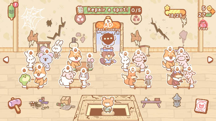 Sau khi nhận được 10 đô la từ ông nội, hãy hoàn thành hướng dẫn sửa chữa và chào mừng Nyanko - nhân viên đầu tiên của nhà hàng. Sau đó, nhấn vào biểu tượng chiếc búa ở góc dưới bên trái để vào lại chế độ sửa chữa.