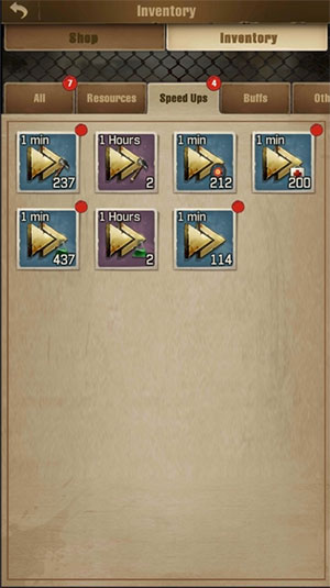 Nếu muốn nâng cấp trại của mình nhanh hơn, đừng ngần ngại sử dụng gói tăng tốc và tài nguyên. Những vật phẩm này nên được dùng mọi lúc khi có thể, đặc biệt là trong giai đoạn bắt đầu của trò chơi, vì nó giúp người chơi lên cấp nhanh hơn nhiều. Sử dụng tăng tốc để ngay lập tức bỏ qua thời gian nâng cấp, nghiên cứu và đào tạo để tăng thêm xếp hạng sức mạnh.