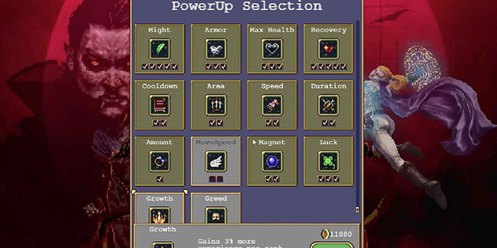 Người chơi cần tập trung vào việc tăng sức mạnh để cải thiện sát thương, thời lượng và số lượng đường đạn của vũ khí. Giảm thời gian hồi chiêu là một PowerUp quan trọng khác. Vì vậy, đừng quên mua PowerUp để làm tăng lượng kinh nghiệm mà một nhân vật nhận được, giúp cơ hội sống sót trong game cao hơn.