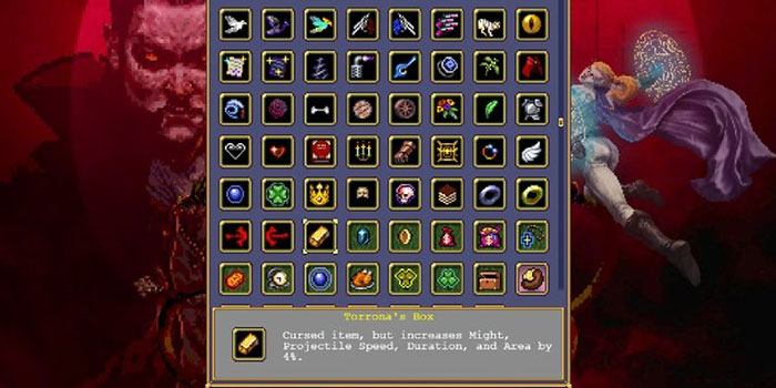 Một trong những vật phẩm thụ động tốt nhất trong trò chơi được cho là Torrona's Box. Vật phẩm tiện dụng này tăng diện tích, thời lượng, sức mạnh và tốc độ (đạn) của tất cả các loại vũ khí. Vấn đề với vật phẩm này là khi đạt đến cấp độ 9, nó sẽ cung cấp tần suất, sức khỏe, số lượng và tốc độ (di chuyển) của kẻ thù.