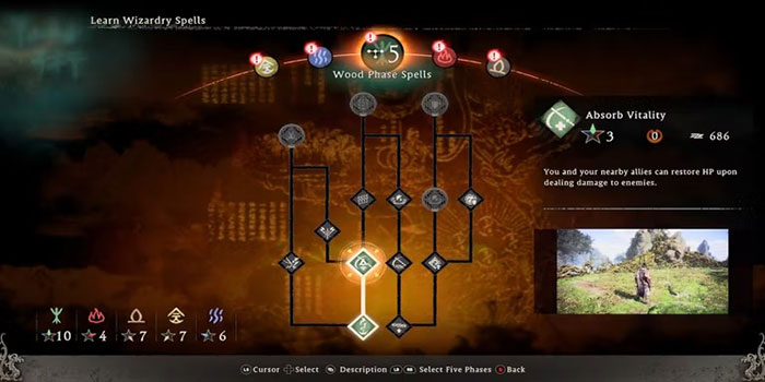 Dù vậy, vẫn có một câu thần chú mà người chơi nên mở khóa ngay lập tức, có tên là Absorb Vitality, thuộc Wood Virtue. Sau khi kích hoạt thần chú này, người chơi có thể hồi máu sau mọi đòn tấn công của kẻ thù.