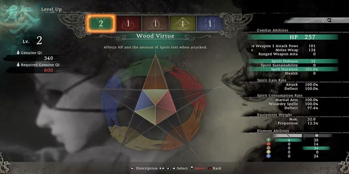 Wo Long: Fallen Dynasty có 5 Virtue, đó là Fire, Water, Earth, Wood và Metal. Mỗi Virtue sẽ tăng một số thứ cụ thể, mặc dù có những chỉ số sẽ tăng cho cả 5 như HP. Game thủ nên thử và tăng cấp cho cả 5 Virtue này cùng nhau, ít nhất là ba bậc.