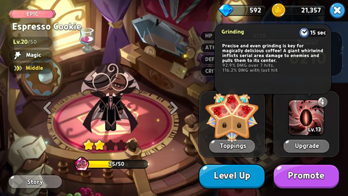 Thay vào đó, Cookie dựa vào một hệ thống tiêu thụ gồm các vật phẩm được gọi là Star Jelly, có thể kiếm bằng cách hoàn thành các mục tiêu, tạo ra chúng từ các House và mua từ các thị trường khác nhau. Khi đã có đủ, hãy chuyển đến màn hình chỉ số của Cookie và tăng cấp chúng nhanh chóng bằng cách cho nhân vật ăn Star Jelly. Giới hạn cấp độ của Cookie được xác định bởi cấp độ của vương quốc.