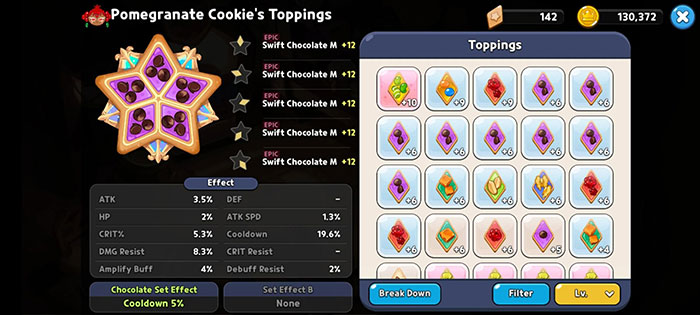Khi Cookie tăng cấp, chúng sẽ mở khóa khả năng trang bị topping. Nhân vật nhận được vị trí topping đầu tiên ở cấp độ 5 và vị trí cuối cùng ở level 30. Các topping đóng vai trò như phụ kiện giúp tăng các chỉ số cụ thể như HP và kháng debuff.