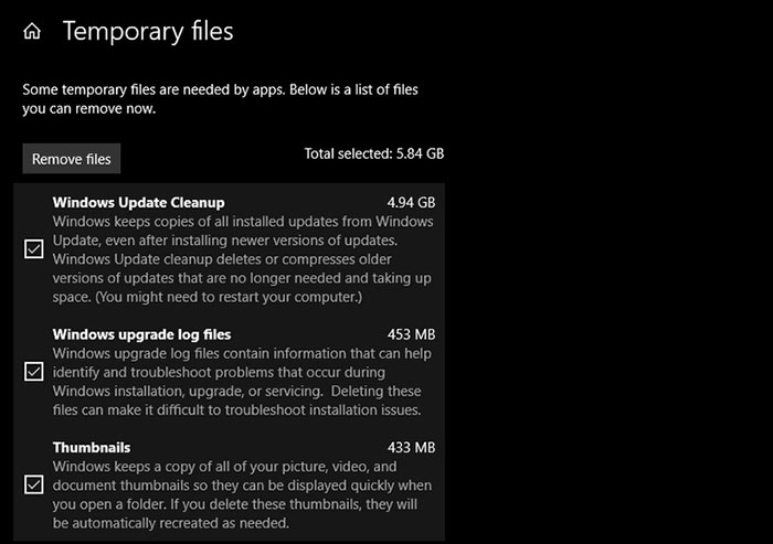 Nếu thấy giao diện này quá rườm rà, hãy tới Settings > System > Storage để thử công cụ dọn dẹp bộ nhớ mới hơn của Windows 10. Nhấp vào Temporary files trong danh sách tùy chọn, sau đó mọi người sẽ thấy một danh sách tương tự như ở Disk Cleanup.