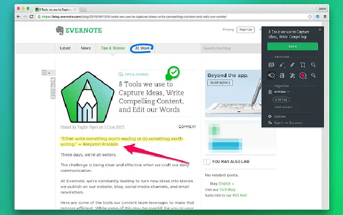 Người dùng thường xuyên của Evernote, công cụ đánh dấu và ký hiệu phổ biến, chắc chắn sẽ muốn dùng tiện ích mở rộng Evernote Web Clipper. Nó cho phép người dùng nhanh chóng đánh dấu văn bản, hình ảnh hoặc cả hai và lưu vào Evernote để sử dụng sau này.