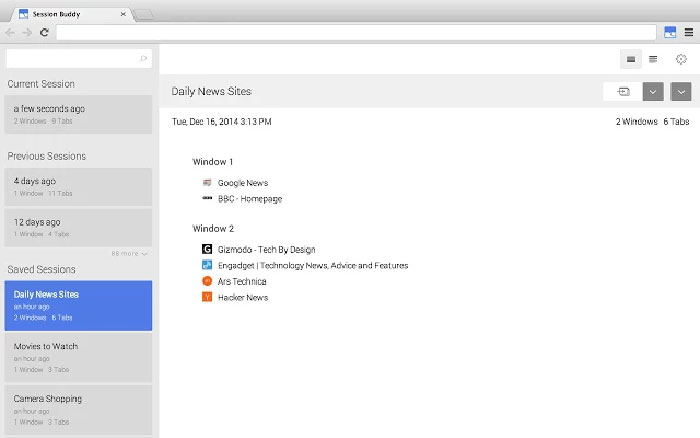 Session Buddy là một công cụ cần thiết cho những người thường mở một tập hợp các tab cụ thể. Nó lưu các phiên hoạt động của các tab mà mọi người muốn mở cùng một lúc. Điều này cũng rất hữu ích nếu Chrome hoặc máy tính hay gặp sự cố. Hệ thống quản lý nội bộ của công cụ thậm chí còn cho phép người dùng tùy chỉnh, lưu, xuất và nhập danh sách phiên một cách dễ dàng.