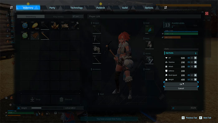 Bất cứ khi nào lên cấp, game thủ sẽ nhận được điểm chỉ số để nâng cấp HP, sức chịu đựng, tấn công, tốc độ làm việc hoặc trọng lượng có thể mang theo. Đầu tiên, việc nâng cấp HP sẽ khiến nhân vật trở nên mạnh mẽ hơn nếu chiến đấu với Pal toàn thời gian. Nhưng người chơi nên cải thiện Stamina (sức chịu đựng) của mình trước vì điều này sẽ giúp nhân vật bơi và leo trèo xa hơn.