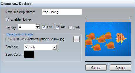 Để tạo cửa sổ làm việc mới, từ giao diện chính của chương trình bạn nhắp chuột vào biểu tượng Create Desktop hình dấu cộng màu xanh. Hộp thoại Create New Desktop hiện ra cho phép bạn thiết lập các mục: