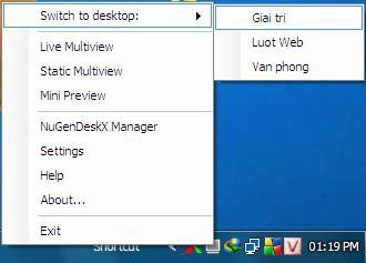 - Ngoài cách truy xuất đến một Desktop nào đó bằng phím nóng hay từ các công cụ quản lý Desktop...bạn có thể nhắp chuột phải vào biểu tượng chiếc màn hình ở khay hệ thống chọn Switch to desktop để truy xuất vào một Desktop nào đó.