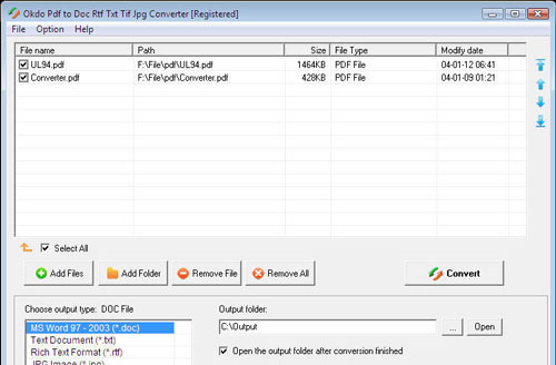 Okdo Pdf to Doc Rtf Txt Tif Jpg Converter là phần mềm chuyển đổi PDF linh hoạt và rất dễ sử dụng. Với phần mềm chuyển đổi chuyên nghiệp này, người dùng có thể chuyển đổi theo nhóm các file PDF sang rất nhiều định dạng như doc, txt, rtf, jpg, jpeg, tiff. Rất dễ để bạn sử dụng phần mềm, chỉ cần thêm các file cần được chuyển đổi vào danh sách rồi nhấn nút Convert là được. Phần mềm này sẽ giữ nguyên cấu trúc, ảnh, văn bản của file PDF gốc. Chất lượng file đầu ra rất tốt và tốc độ chuyển đổi siêu nhanh. Người dùng chắc chắn sẽ thích phần mềm khi sử dụng nó.