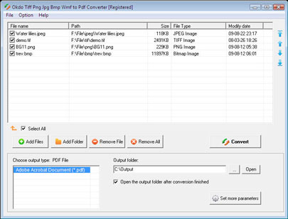Okdo Tiff Png Jpg Bmp Wmf to Pdf Converter là một công cụ chuyển đổi PDF mạnh mẽ và dễ dàng, có thể giúp bạn chuyển đổi hàng loạt định dạng file jpg, jpeg, bmp, tif, wmf, png sang PDF một cách dễ dàng.