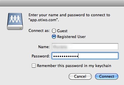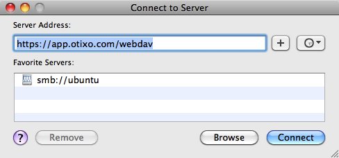 Nhập https://app.otixo.com/webdav trong trường server addres và nhấn nút Connect