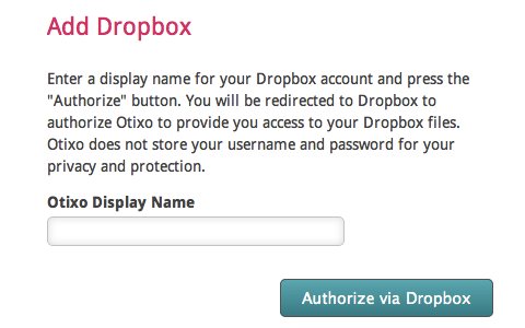 Để thêm một dịch vụ đám mây, bạn nhấn vào biểu tượng tương ứng của dịch vụ trong danh sách. Otixo sẽ yêu cầu bạn đặt tên cho tài khoản ở trường Display Name. Bạn có thể đặt bất tên nào tùy thích nhưng lời khuyên bạn nên sử dụng một cái tên liên quan đến dịch vụ để sau này bạn sẽ không gặp vấn đề khi khai báo tài khoản.