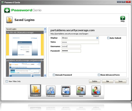 Password Genie là phần mềm quản lý mật khẩu có thể hoạt động trên nhiều máy tính, người dùng và trình duyệt, cũng như được thiết kế với mục đích bảo mật và tiện ích. Người dùng có thể dễ dàng lưu lại tất cả tên người dùng và mật khẩu trong một nơi bảo mật nào đó đã được bảo vệ và chỉ có thể truy cập bởi chính người dùng.