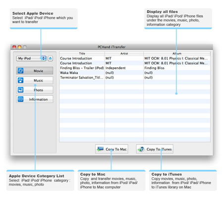 PCHand iTransfer for Mac là một công cụ truyền và sao lưu kết hợp Mac iPad Transfer, Mac iPod Transfer và iPhone iTransfer for Mac. Điều này iTransfer Mac có thể dễ dàng chuyển phim ảnh, âm nhạc, video, chương trình TV, podcast và ảnh từ iPad / iPod / iPhone vào thư viện iTunes trên máy Mac hoặc máy tính Mac. Đó là hoàn toàn tương thích với iPad, iPhone, iPhone mới nhất IOS 4, 4, tất cả các dòng iPod và iTunes 10.