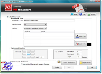 Phần mềm PDF Watermark cho phép bạn thêm các hình mờ văn bản vào số lượng lớn tập tin PDF chỉ với một click duy nhất. Chương trình có thể thêm văn bản bản quyền hay logo trên mỗi trang của tập tin PDF. Công cụ PDF Watermark là tiện ích nâng cao cho việc xử lý tập tin PDF trong chế độ theo lô. Người dùng có thể thiết lập phông chữ, kích thước chữ, màu sắc và góc độ văn bản. Chương trình cung cấp 2 tùy chọn sẵn có: thêm hình mờ trên nội dung và dưới nội dung. Người dùng cũng có thể thiết lập vị trí tùy chỉnh của hình mờ trên trang PDF bằng cách thêm lề trái và phải.