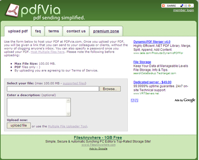 PDFvia là một ứng dụng web miễn phí mà cho phép người dùng dễ dàng chia sẻ tập tin PDF của mình với bất kì người nào tại bất kì đâu trên thế giới. Mỗi một lần tải lên một tập tin PDF, bạn sẽ được cung cấp một đường dẫn liên kết và từ đó, thông qua liên kết này bạn có thể gửi cho đồng nghiệp, khách hàng, bạn bè người thân nhằm mục đích chia sẻ, công việc mà không lo có bất cứ vấn đề rủi ro nào xảy ra. Bảo mật hơn với tính năng đính kèm mật khẩu tương ứng cho từng tập tin PDF. Với PDFvia, bạn có thể cùng một lúc tải lên nhiều tập tin PDF.