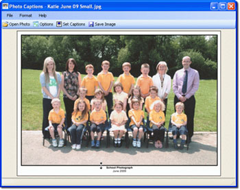 Photo-Captions là một phần mềm mà cho phép bạn thêm các chú thích vào dưới cùng của các bức ảnh, một tỉ lệ cố định được thiết đặt cho phép bức ảnh có thể được tạo theo một kích thước tiêu chuẩn. Đường viền cũng có thể được thêm vào và có thể tùy chỉnh chúng. Với chương trình này, bạn sẽ có các bức ảnh cuối cùng có thể được lưu như một hình ảnh độ phân giải cao.