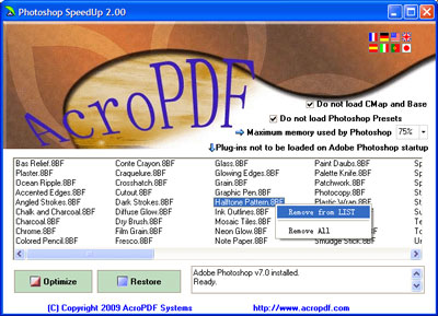 - Bạn vẫn có thể tự thay đổi được việc nạp các tập tin khi Phototoshop khởi động bằng cách nhấp chọn hoặc bỏ chọn các dấu kiểm tại các “Check Box” trong cửa sổ chương trình Photoshop SpeedUp. Hoặc nếu như bạn vẫn muốn tiếp tục sử dụng lại các plugin cần thiết cho công việc xử lý ảnh của mình thì trong khung “Plug-ins not to be load on Adobe Photoshop starup” liệt kê danh sách các Plug-ins bạn nhắp phím phải chuột vào tên của các Plug-in đó, sau đó chọn lệnh Remove from LIST từ men cảm ngữ cảnh. Ngoài ra, bạn cũng vẫn có thể thay đổi dung lượng bộ nhớ hệ thống dành cho Photoshop sử dụng trong hộp “Maximum memory used by Photoshop” - mặc định là 75%.