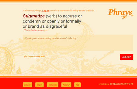 Cách trình bày của web này chỉ đưa ra từ vựng rồi giải thích một cách đơn giản, ngắn gọn nhất. Hoạt động khá hay trên web này là bạn cần là thành viên của trang, rồi viết câu văn sử dụng từ vựng đó. Nếu câu văn được nhiều người bình chọn, chứng tỏ khả năng viết của bạn cũng không tồi chút nào. Bạn tham khảo thêm các câu viết của những người khác để học hỏi thêm.
