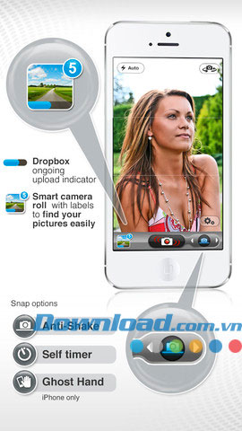 Đặc điểm nổi bật của PicItEasy for iOS chính là khả năng chụp ảnh mà không cần chạm tay vào màn hình, chia sẻ ảnh dễ dàng với tài khoản dịch vụ đám mây Dropbox hoặc sử dụng khả năng chống rung để có những bức hình ổn định, rõ nét.