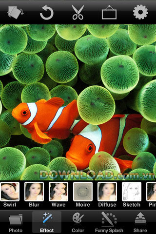 Ứng dụng bao gồm bộ sưu tập hiệu ứng phong phú: Sepia, Black and White, Pencil Paint, Mirror, Swirl, Neon Light, Hue Green, Rainbow, Emboss, Comic,Ice, Blur, Pinch, Wave, Old Film Frame, , Solarize, Old Photo, Oilpainting...