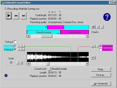 PolderbitS Sound Recorder and Editor là chương trình sẽ giúp lưu âm thanh từ băng cassette sang CD, hỗ trợ nhiều cổng kết nối thu âm. Ngoài ra, nó còn cung cấp chức năng chỉnh sửa chất lượng âm thanh trước khi chép ra CD.