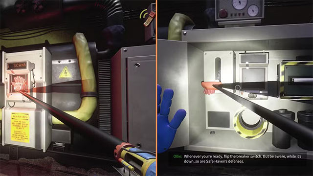 Sau đó, bạn lật công tắc ngắt mạch màu đỏ ở bên trái máy phát điện. Theo Ollie, thao tác này sẽ reset máy phát và thậm chí có thể tắt hệ thống phòng thủ của Safe Haven nếu tắt quá lâu.