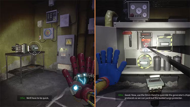 Đầu tiên, bạn phải đặt Omni-Hand lên máy quét màu đỏ ở bên cạnh máy phát điện. Chiếc máy phát điện sẽ mở nắp, cho thấy phần máy bên trong cần được sửa chữa.