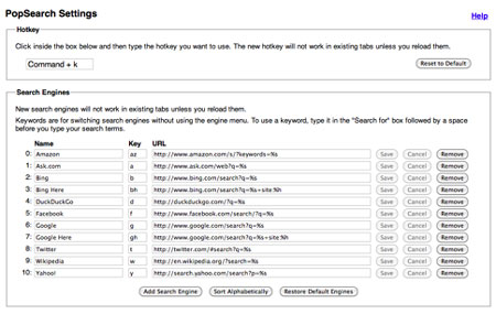 Khi bạn nhấn một phím kết hợp – chọn kết hợp trong Preferences của tiện ích - PopSearch của Canisbos Computing sẽ hiển thị một hộp tìm kiếm cho phép bạn tìm bất kì một trong 14 trang khác nhau. Danh sách các trang này hiển nhiên bao gồm Google, Bing và Wikipedia cùng với các lựa chọn khác ít được biết đến hơn như Amazon, tài khoản Instapaper, Twitter và Facebook.
