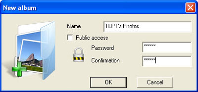 Ở giao diện chương trình, bạn chọn Create album để tạo một album mới, nếu không muốn người khác xem được, bạn bỏ dấu chọn trước dòng Public access rồi nhập password vào 2 dòng Password và Confirmation. Xong, bấm OK.