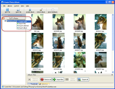 Sau khi tạo album, bạn bấm nút Import files để chọn các ảnh đưa vào album (bấm Ctrl để chọn cùng lúc nhiều ảnh). Bạn cũng có thể tạo một folder con trong album ảnh, bằng cách bấm phải vào tên album bên phải, chọn Create folder. Nếu muốn xóa hết các ảnh đã chọn, bấm nút Remove all.