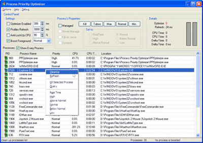 Tương thích với nhiều phiên bản Windows hiện nay, Process Priority Optimizer có thể giám sát được toàn bộ các tiến trình đang hoạt động trên máy tính, qua đó giúp người dùng có thể nhận biết được chương trình nào hợp lệ và không hợp lệ đang tự hoạt động. Chương trình rất đơn giản cài đặt và sử dụng, có thể tắt bất kỳ chương trình ứng dụng nào, tùy chỉnh dung lượng bộ nhớ hệ thống cho từng ứng dụng tùy vào người sử dụng, cải thiện tốc độ hệ thống, tính năng Anti-LockUp đi kèm có tác dụng tự động làm giảm xung nhịp hoạt động của CPU trước những tiến trình lạ trong hệ thống, chỉ sử dụng khoảng 10Mb bộ nhớ trong (RAM), giao diện với 2 ngôn ngữ chính là tiếng Anh và Hungary.