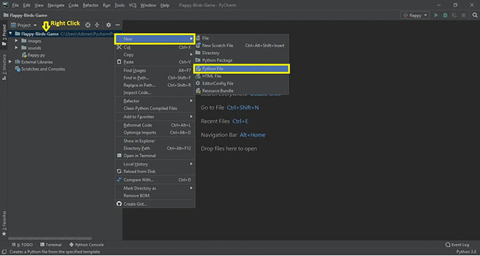 Sau khi tạo dự án, hãy nhấp chuột phải vào tên dự án của mình, chọn New và nhấn Python file.