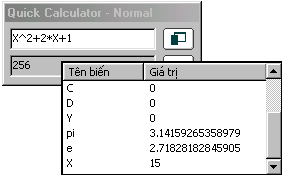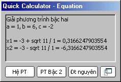 Quick Calulator là phần mềm làm tính nhỏ gọn và rất tiện lợi. Ngoài chức năng thực hiện các phép toán thông thường, phần mềm còn có khả năng tính toán với phân số, đa thức, giải phương trình, hệ phương trình, tính toán với các số nguyên lớn, làm việc với số nguyên tố, v.v... Cũng như nhiều chương trình thông dụng khác, Quick Calculator hiển thị một thanh công thức đơn giản cho phép bạn trực tiếp nhập biểu thức để tính toán: