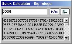 Do chưa có thuật toán tốt nên tốc độ các phép toán chưa được nhanh (chỉ tính được tới 3000!), riêng phép chia tương đối chậm. Ngoài ra ta còn có thể thực hiện phép lấy căn bậc hai, căn bậc ba và các hàm Max, Min, USCLN, BSCNN với các số nguyên lớn. Đặc biệt, chương trình còn cho phép thể hiện các chữ số thập phân của số pi và số e (tới hàng ngàn chữ số) (^_^)