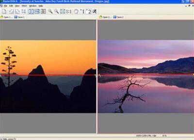 Thực hiện mọi thao tác y hệt như đã trình bày ở trên với tấm hình bên phải với mục đích chia tấm hình mặt hồ ra thành 2 phần bằng nhau, hệt như tấm hình núi non. Khi đã hoàn tất việc chia làm đôi 2 hình cần ghép, bạn chỉ việc nhấn vào nút “Start Stiching” (có hình người đang chạy) để RasterStich ghép phần trên của hình núi non với phần dưới của hình mặt hồ lung linh. Kết quả của quá trình ghép cũng đã tạo nên một tấm ảnh số thơ mộng đến lạ lùng.