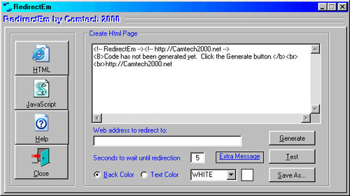 RedirectEm giúp bạn tạo một trang redirect bằng HTML hay JavaScript dễ dàng qua việc chèn địa chỉ web mà bạn muốn gửi người dùng đến đó. Thêm vào đó chương trình còn có các tùy chọn khác như chọn số giây cần phải đợi khi người dùng đến được trang redirect, chọn màu nền và màu chữ và nhập các thông báo cá nhân của bạn.