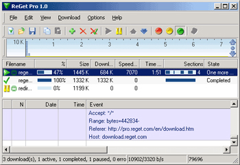 ReGet Pro được thiết cho những người sử dụng cần một chương trình quản lý download nhỏ gọn, nhanh và thân thiện với hàng loạt các tính năng cần thiết. ReGet Pro có thể tăng tốc độ download lên tới 3-5 lần bằng cách chia nhỏ tập tin ra thành section và tải về ngẫu nhiên các section đó. ReGet Pro cũng có khả năng tự động reconnect và resume. Chương trình hỗ trợ đồng thời cả tải về các tập tin (FTP) và trang web(HTTP).